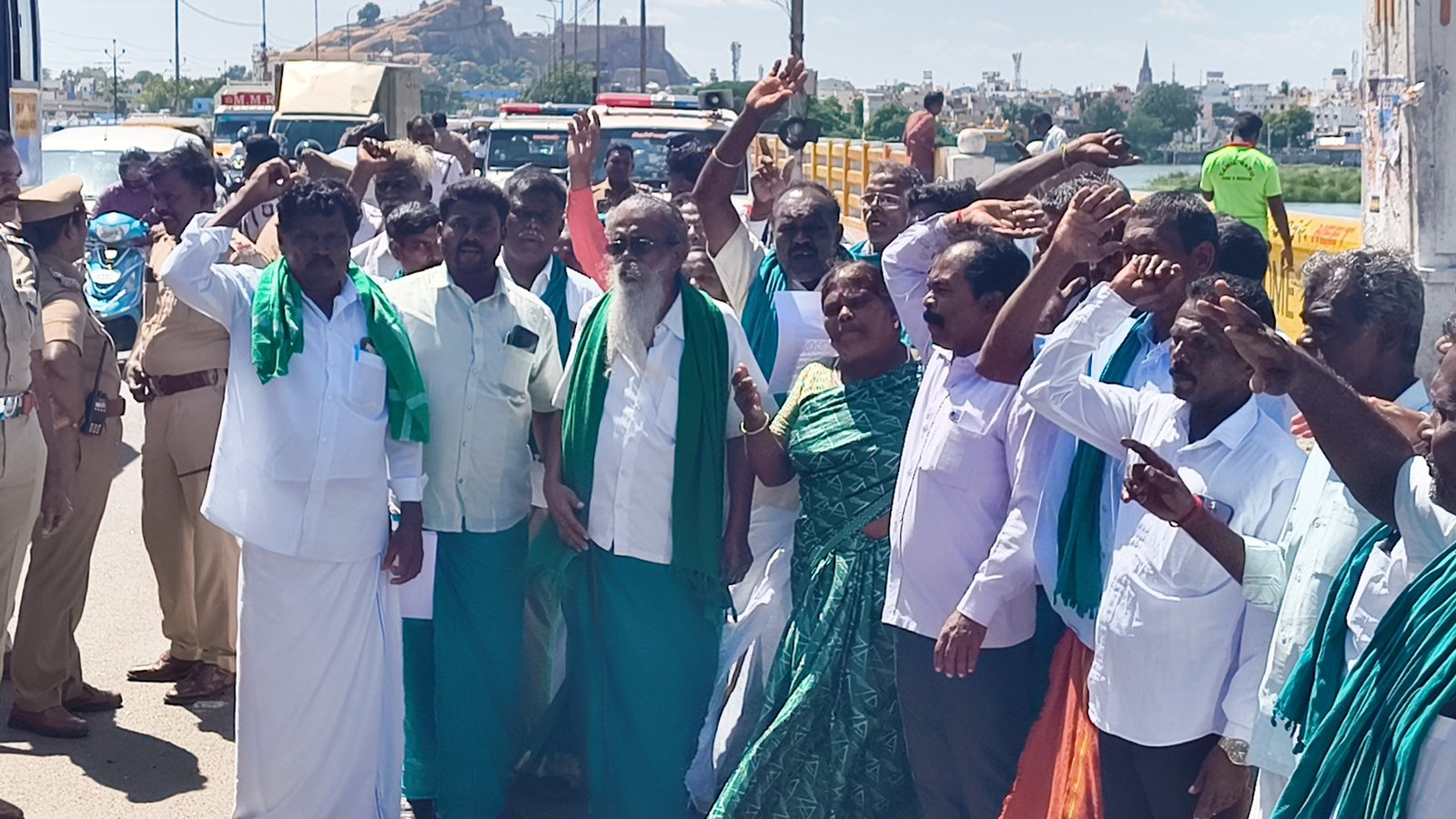 தொடர்ந்து காவேரி அய்யாறு திட்டத்தை நிறைவேற்ற வேண்டும் நெல் கொள்முதல் நிலையங்களில் லஞ்சம் வாங்குவதை தடுக்க வேண்டும் உள்ளிட்ட கோரிக்கைகளை வலியுறுத்தி காவிரி பாலம் தொடங்கும் இடத்தில் மனித சங்கிலி போராட்டத்தில் ஈடுபட்டனர்.