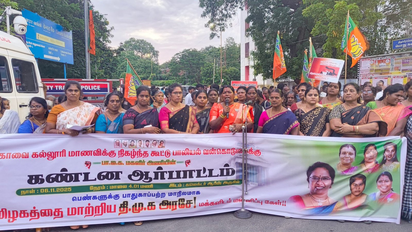 கோவை கல்லூரி மாணவிக்கு நிகழ்ந்த கூட்டு பாலியல் வன்கொடுமைக்கு எதிராக தமிழகம் முழுவதும் பாஜக மகளிரணி சார்பில் கண்டன ஆர்ப்பாட்டம் நடத்தி வருகின்றனர்.