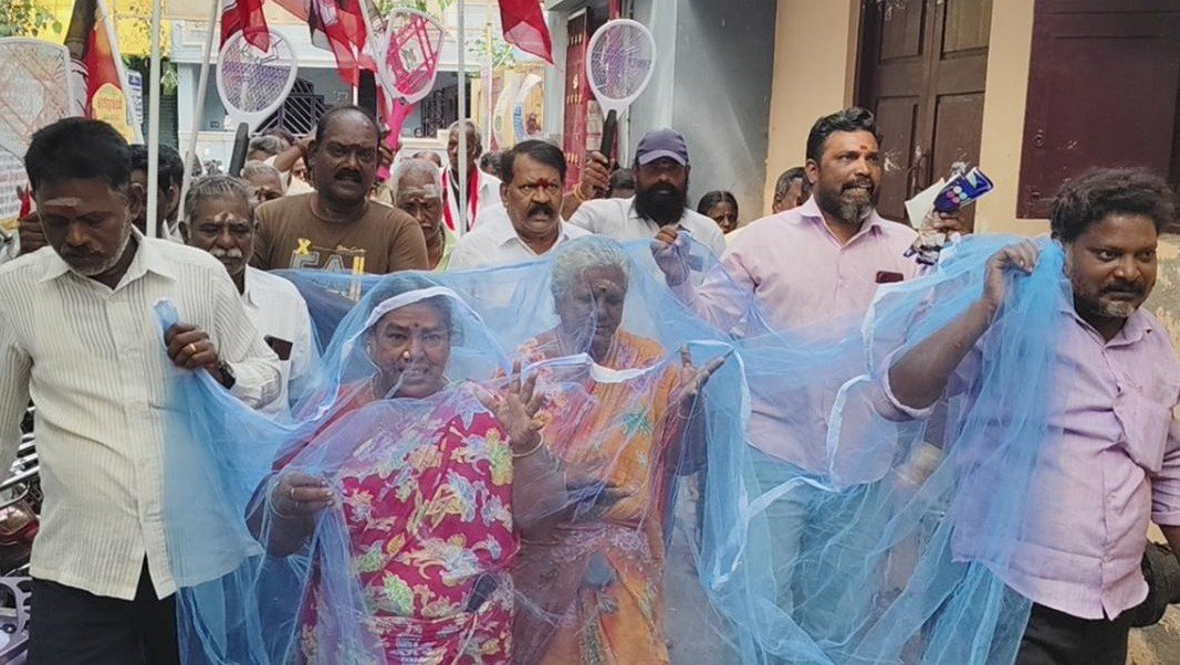 நடவடிக்கை கோரி புதுச்சேரியில் கொசு வலை போர்த்தி நூதன போராட்டம்