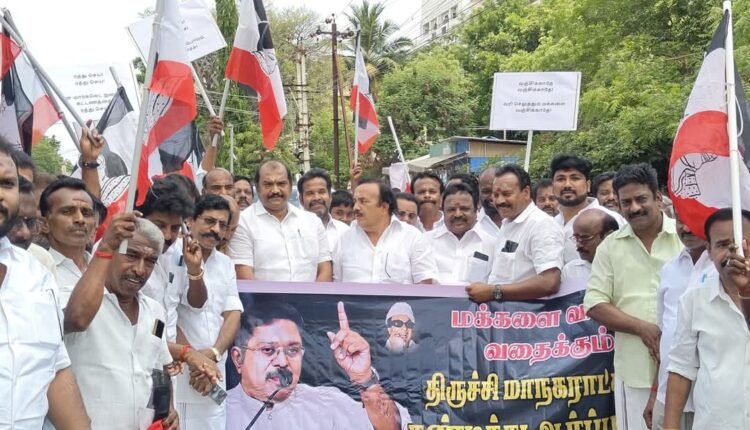 தலைமை நிலைய செயலாளர், முன்னாள் சட்டமன்ற உறுப்பினர் ராஜசேகரன் மற்றும் திருச்சி தெற்கு மாவட்ட செயலாளர், முன்னாள் மாமன்ற உறுப்பினர் செந்தில்நாதன் உள்பட நிர்வாகிகள் பலர் கலந்து கொண்டு மாநகராட்சியை கண்டித்து கோஷங்களை எழுப்பினர். தொடர்ந்து மாநகராட்சி துணை ஆணையரை சந்தித்து மனு அளித்தனர்.