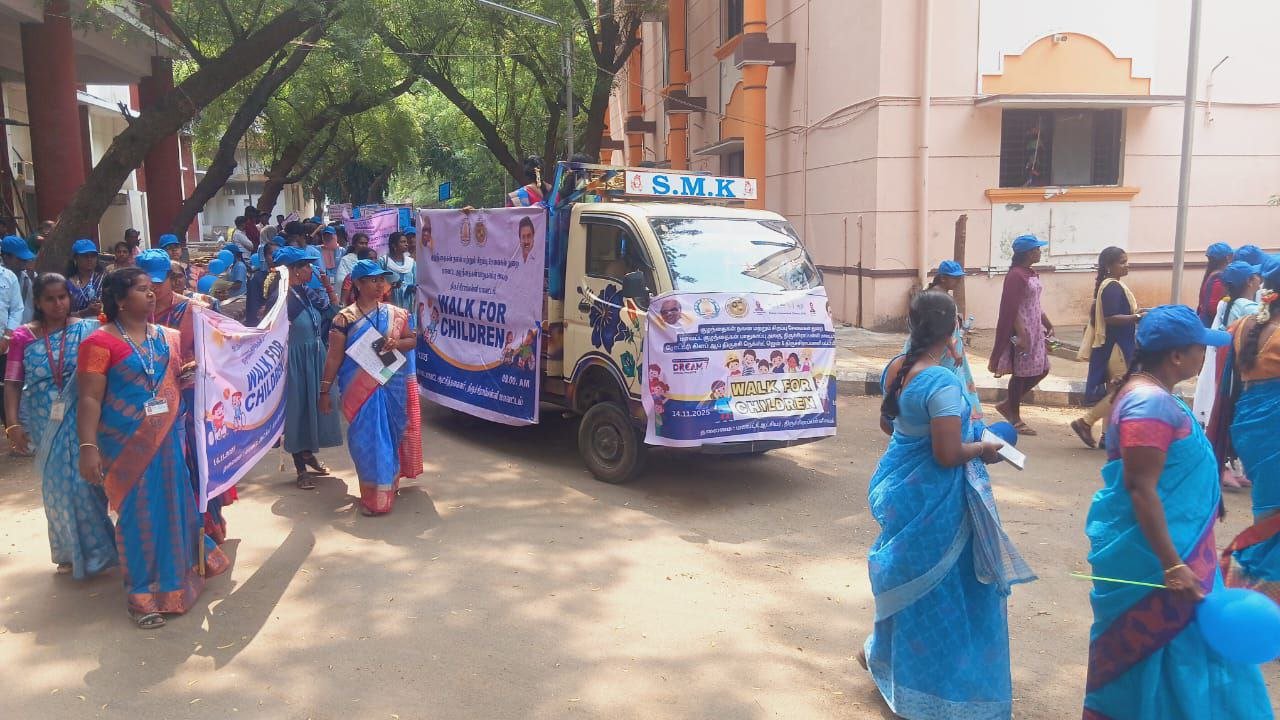 நவம்பர் 14 அன்று குழந்தைகள் தினம் நவம்பர் 19 அன்று உலக குழந்தைகள் மீதான வன்முறை தடுப்பு தினம் நவம்பர் 20 சர்வதேச குழந்தைகள் தினம் ஆகியவற்றை முன்னிட்டு, இன்று 14. 11.2025 முற்பகல் 10.00 மணி அளவில் குழந்தைகளுக்கான நடை என்ற பெயரில் விழிப்புணர்வு பேரணி மற்றும் கையெழுத்து இயக்கம் நடைபெற்றது. இப்பேரணியின் துவக்கத்தில் சிறப்பு விருந்தினர்களான தமிழ்நாடு மாநில குழந்தை உரிமை பாதுகாப்பு ஆணைய உறுப்பினர் திரு.வெ. செல்வேந்திரன் அவர்கள் மற்றும் திருச்சிராப்பள்ளி மாவட்ட வருவாய் அலுவலர் திரு. பாலாஜி அவர்களுக்கு தமிழர்களின் பாரம்பரிய கலை நிகழ்ச்சிகளான பரதநாட்டியம், சிலம்பம், கராத்தே, கரகாட்டம் மற்றும் பறை இசை போன்ற கலை நிகழ்ச்சிகளின் மூலமாக வரவேற்பு வழங்கப்பட்டது. இதனை தொடர்ந்து கையெழுத்து இயக்க பதாகையில் திருச்சிராப்பள்ளி மாவட்ட வருவாய் அலுவலர், தமிழ்நாடு மாநில குழந்தை உரிமை பாதுகாப்பு ஆணைய உறுப்பினர் அவர்களால் கையொப்பம் இடப்பட்டு பேரணி கொடியசைத்து துவக்கி வைக்கப்பட்டது. இப்பேரணியானது மாவட்ட ஆட்சியரகத்தில் தொடங்கி மிளகு பாறை, பெரியார் ரவுண்டானா வழியாக கலையரங்கம் திருமண மண்டப வளாகத்தில் நிறைவு பெற்றது.