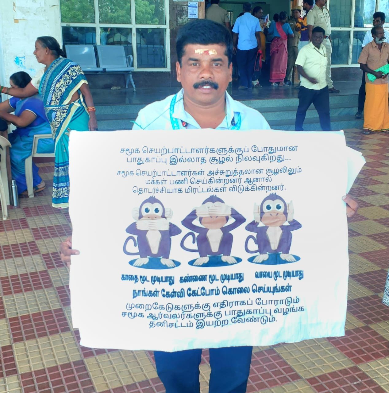 காதையும், கண்ணையும் வாயையும் மூடமுடியாது எங்களையும் கொலை செய்யுங்கள் என்ற வாசகங்கள் அடங்கிய பதாகையை கழுத்தில் மாலையாக அணிந்து சமூக ஆர்வலராகிய ஈ.பி.அ.சரவணன் திருப்பூர் மாவட்ட ஆட்சியரிடம் மனு அளித்தார்.