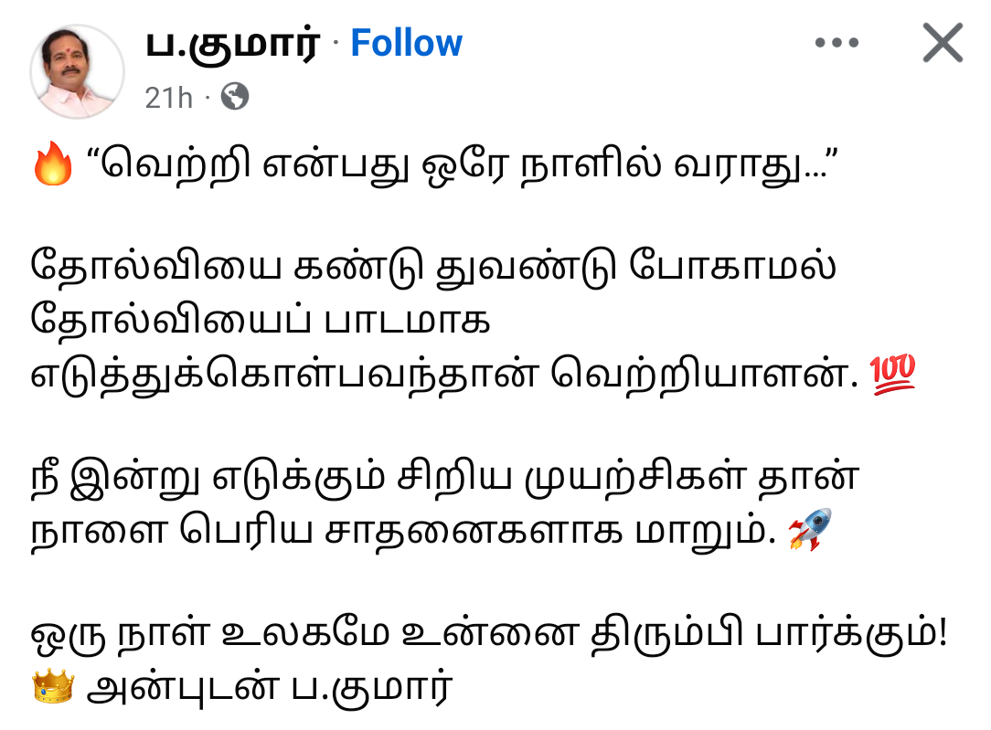 சமீபத்தில் ப. குமார் தனது முகநூல் பக்கத்தில் பதிவிட்ட கருத்துக்கள், அவர் திருவெறும்பூர் தொகுதியில் மீண்டும் போட்டியிடத் தயங்குகிறாரோ என்ற கேள்வியை எழுப்பியுள்ளது. குறிப்பாக, தொகுதி அறிவிப்பிற்கு முன்பே அவர் வெளியிட்டுள்ள பதிவுகளில் ஒருவித “வெற்றி வாய்ப்பு குறித்த கணக்கீடு” தெரிவதாக அரசியல் விமர்சகர்கள் கருதுகின்றனர். இது அவர் தோல்வி பயத்தில் இருக்கிறாரா அல்லது பாதுகாப்பான தொகுதியை நாடுகிறாரா என்ற விவாதத்தை சமூக வலைதளங்களில் கிளப்பியுள்ளது.