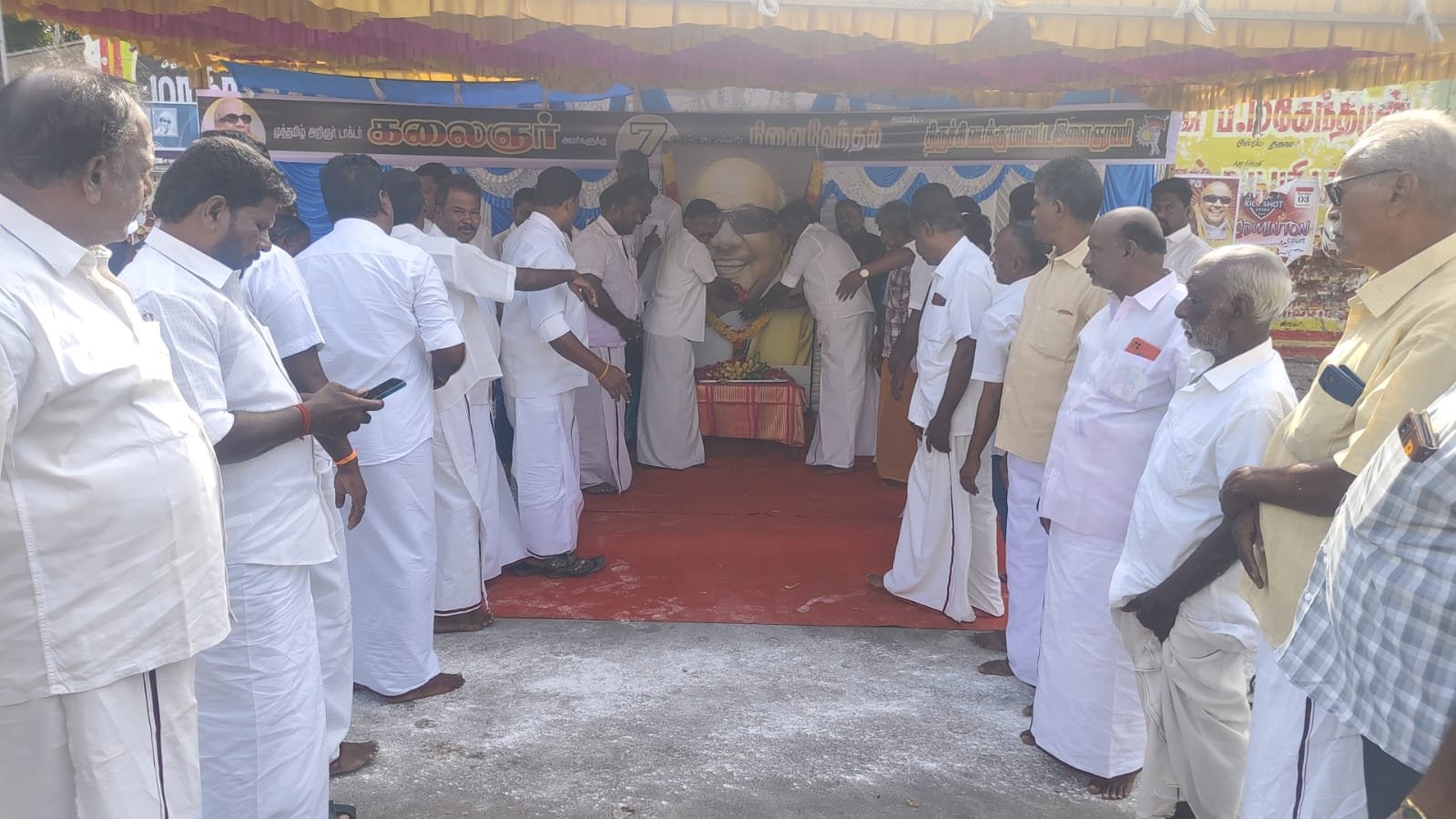 கட்சி நிர்வாகிகள் கலந்து கொண்டு முன்னாள் முதல்வர் கலைஞரின் நினைவு நாளில் படத்திற்கு மாலை அணிவித்து மரியாதை செய்தி வீரவணக்கம் ஒலி எழுப்பினர்