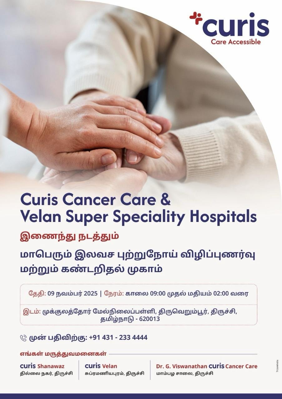 கியூரிஸ் புற்றுநோய் பராமரிப்பு & வேலன் சூப்பர் ஸ்பெஷாலிட்டி மருத்துவமனைகள் இணைந்து நடத்தும் மாபெரும் இலவச புற்றுநோய் விழிப்புணர்வு மற்றும் கண்டறிதல் முகாம் நாளை நவம்பர் 9ஆம் தேதி காலை 9 மணி முதல் மதியம் 2 மணி வரை திருச்சி திருவெறும்பூர் முக்குலத்தோர் மேல்நிலைப் பள்ளியில் நடைபெறுகிறது