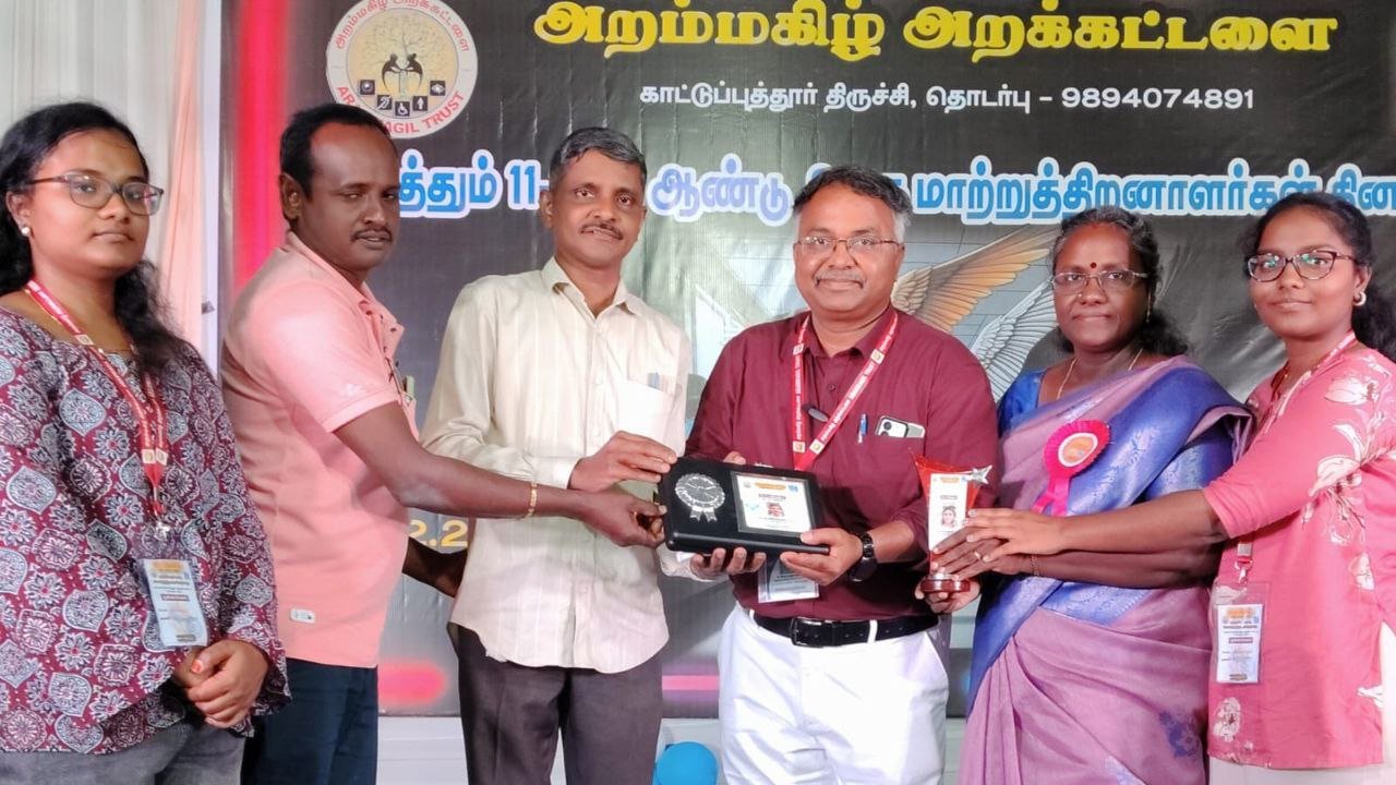 திருச்சி மாவட்டம், காட்டுப்புத்தூர் அறம் மகிழ் அறக்கட்டளை பதினொன்றாம் ஆண்டு விழா காட்டுப்புத்தூர் நாராயண பிரம்மேந்திரர் திருமண மண்டபத்தில் நடைபெற்றது.விழாவில்,அறம் அறக்கட்டளை நிறுவனர் லோகநாதன்,மருதம்பட்டி அரசு தொடக்கப்பள்ளி இடைநிலை ஆசிரியர் தவமணி, இயன் முறை மருத்துவ மாணவி திவ்யதர்ஷினி, சட்ட படிப்பு பயிலும் மாணவி மாயாவதி முன்னிலையில் ஆதரவற்ற நிலையில் இறந்துபோனவர்கள அனாதையாக அல்லது உரிமை கோரப்படாதப் பிணங்களை திருச்சி மாவட்டத்தில் மயானப் பூமியில் மனைவி வழக்கறிஞர் சித்ரா,மகள் கீர்த்தனா விஜயகுமார் உடன் அமிர்தம் சமூக சேவை அறக்கட்டளை நிர்வாக அறங்காவலர் யோகா ஆசிரியர் விஜயகுமார் கண்ணியமான முறையில் இறுதிச் சடங்குகள் செய்து நல்அடக்கம் செய்து வருகின்றார்.இவர்களது தன்னலமற்ற மனிதாபிமான சேவையைப் பாராட்டி மதிப்புறு மனித நேயர் விருது