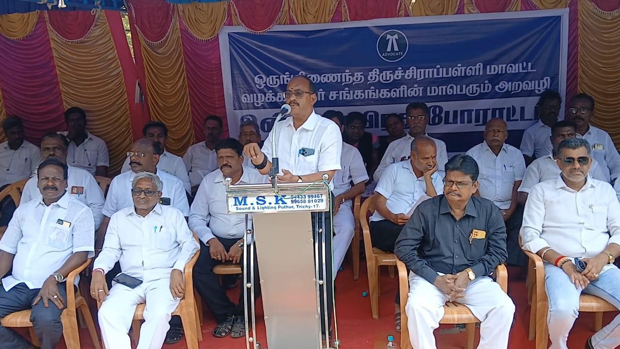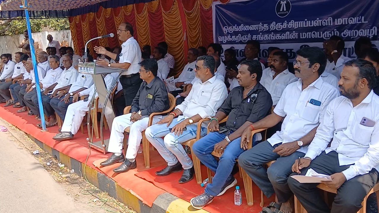 செயலாளர் சி.முத்துமாரி ஆகியோர் தலைமை வகித்தனர். திருச்சிராப்பள்ளி குற்றவியல் வழக்கறிஞர் சங்க தலைவர் முல்லை சுரேஷ், செயலாளர் பி.வி.வெங்கட் , திருச்சிராப்பள்ளி