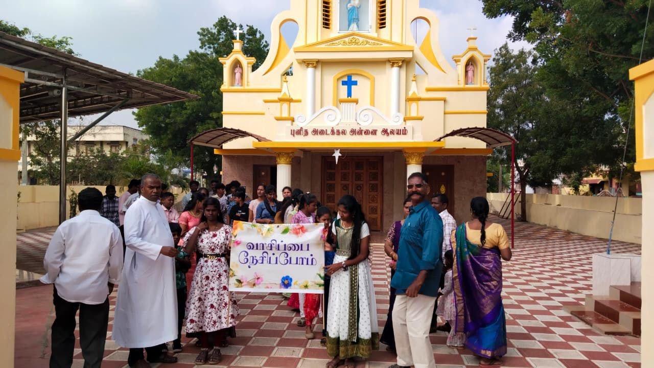 புதுக்கோட்டை மாவட்டம்,திருமயம் அடைக்கல மாதா ஆலயத்தில் இருந்து இளைய தலைமுறைகளை சமூக ஊடகங்களுக்கு அடிமையாக்காமல் அவர்களுக்கு புத்தக வாசிப்பை ஊக்குவிக்கும் விதமாக வாசிப்பை நேசிப்போம் என்ற விழிப்புணர்வு பேரணி. திருமயம் அடைக்கலமாதா பங்குத்தந்தை ஜேம்ஸ் ராஜ் அவர்களின் தலைமையில் செந்தமிழ் ஆர்வலர் அகஸ்டின், அவர்கள் வழிகாட்டுதலின்படி பேரணி வாசிப்பை நேசிப்போம் என்ற பதாகையுடன் தீரர் சத்தியமூர்த்தி கிளை நூலகம் சென்றடைந்தது பேரணியில் வருகை தந்த அனைவரையும் நூலகர் மாலதி வரவேற்றார். மேலும் வாசகர் வட்ட துணைத்தலைவர் பிரபாகர் மாணவ மாணவியருக்கு வாசகர் வட்டத்தின் செயல்பாடுகளை தெளிவாக எடுத்து கூறினார்.அதனைத் தொடர்ந்து பங்குத்தந்தை அவர்கள் மாணவ,மாணவிகளுக்கு நல்ல பல கருத்துக்களை எடுத்துக் கூறினார்.
