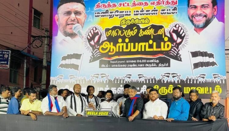 ஒன்றிய அரசின் வக்ஃப் திருத்தச் சட்டம் 2024-ஐ கண்டித்து மனிதநேய மக்கள் கட்சியின் ஒருங்கிணைந்த திருச்சி மாவட்டம் சார்பில், பாலக்கரை ரவுண்டானா அருகே நேற்று மாலை கண்டன ஆர்ப்பாட்டம் நடைபெற்றது. ஆர்ப்பாட்டத்திற்கு கிழக்கு மாவட்ட தலைவர் முகமது ராஜா தலைமை தாங்கினார். திருச்சி மேற்கு மாவட்ட தலைவரும் 28 வது வார்டு மாமன்ற உறுப்பினருமான பைஸ் அகமது கண்டன கோஷம் எழுப்பி ஆர்பாட்டத்தை துவக்கி வைத்தார்.