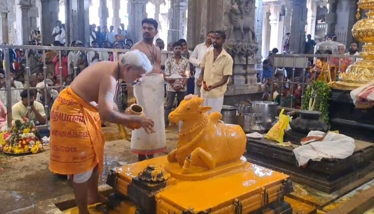 ஆனி மாத வளர்பிறை பிரதோஷம் – திருவானைக்காவல் ஜம்புகேஸ்வரர் ஆலயத்தில் நந்தி பகவானுக்கு மகா அபிஷேகம் – பெருந்திரளான பக்தர்கள் ஓம்நமச்சிவாய என்ற பக்திகோசத்துடன் வழிபாடு