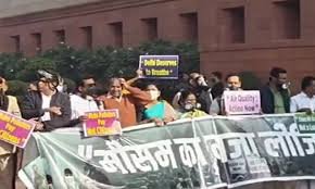 டெல்லியில் காற்று மாசுபாட்டை தடுக்க நடவடிக்கை எடுக்கக் கோரி எதிர்க்கட்சி எம்.பி.க்கள் முககவசம் அணிந்து போராட்டம்.