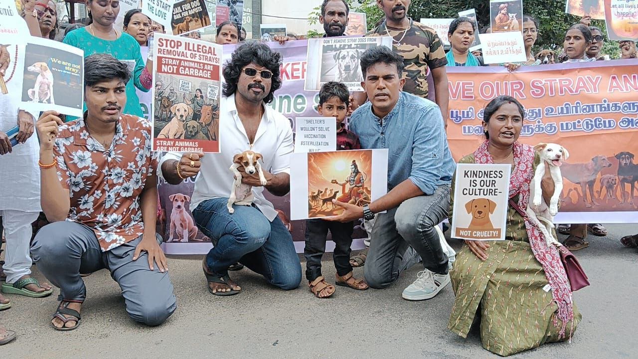 தெரு நாய் மையத்தில் அடைக்க வேண்டுமென சமீபத்தில் உச்ச நீதிமன்றம் தீர்ப்பளித்திருந்தது நிலையில் இதனை கண்டித்து தெருநாய் வெல்ஃபேர் அசோசியேசன் சார்பில் திருச்சி ஜங்ஷன் பகுதியில் ஆர்ப்பாட்டம் நடைபெற்றது. இதில் நலசங்கத்தை சேர்ந்தவர்கள் திரளாக கலந்து கொண்டு, தெரு நாய்களை காப்பகத்தில் அடைக்கக் கூடாது என பதாகைகளை கையில் ஏந்தி கோஷங்களை எழுப்பினர்.