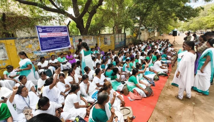 தமிழ்நாடு அரசு கிராம சுகாதார செவிலியர் நலச்சங்கம், தமிழ்நாடு அரசு கிராம சுகாதார, செவிலியர்கள் கூட்டமைப்பு சார்பில், 9 அம்ச கோரிக்கைகளை வலியுறுத்தி, முதல்வரின் கவனத்தை ஈர்க்கும் விதமாக பெருந்திரள் முறையீடு மற்றும் காத்திருப்பு போராட்டம் திருச்சி மாவட்ட ஆட்சியர் அலுவலகம் அருகே இன்று நடைபெற்றது. 3800 துணை சுகாதார நிலையங்களில் காலியாக உள்ள பணியிடங்களில் கிராம சுகாதார செவிலியர்களை பணியமர்த்த வேண்டும்,