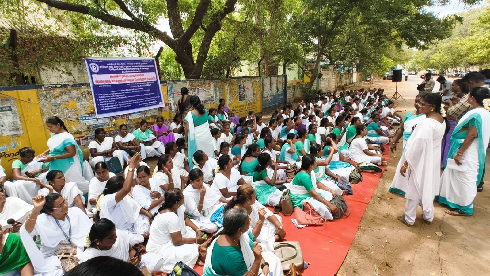 9 அம்ச கோரிக்கைகளை வலியுறுத்தி இன்று பெருந்திரள் முறையீடு நடைபெற்று வருகிறது. 3800 காலிப்பணியிடங்கள் இன்று வரை நிரப்பப்படாமல் உள்ளது. அடித்தட்டு மக்களாகிய கிராம சுகாதார செவிலியர்களை, அந்த பணியிடங்களில் நிரப்ப வேண்டும். துணை சுகாதார நிலையங்களில், தடுப்பூசி போடும் பணியை தற்காலிக பணியாளர்களை கொண்டு போடலாம் என்ற ஆணையை ஏத்து செய்ய வேண்டும். வாடகையற்ற குடியிருப்புகள் அனைவருக்கும் வழங்க வேண்டும். தற்போது தொடங்கப்பட்டுள்ள health and wellness center இல் குடிநீர் வசதி உள்ளிட்ட அடிப்படை தேவைகள் இல்லை. அதற்கு வாடகை பிடித்தம் செய்வதை நிறுத்த வேண்டும். ஆண் பணியாளர்களுக்கு கிரேடு 2 வழங்கி, 5 முதல் 8 வருடங்களில் கிரேடு 1 வழங்கியுள்ளார்கள். அதை போல பெண் பணியாளர்களுக்கும் வழங்க வேண்டும் உள்ளிட்ட கோரிக்கைகளை வலியுறுத்தி இன்று பெருந்திரள் முறையீட்டில் ஈடுபட்டு வருகிறோம். அடுத்த கட்ட நடவடிக்கையாக முதல்வர் கவனத்தை ஈர்க்கும் வகையில் வரும் 11 ஆம் தேதி சென்னையில் உண்ணாவிரத போராட்டம் நடத்த உள்ளோம் என தெரிவித்தார்.