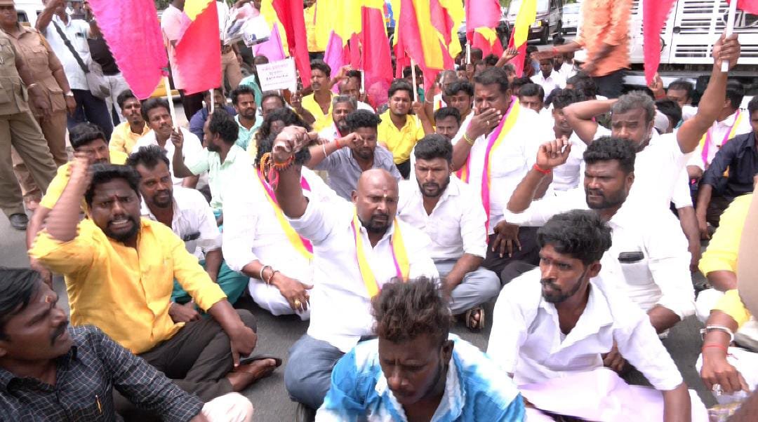 காமராஜர் குறித்து கருத்துகளை தெரிவித்த திருச்சி சிவா எம்பியை கண்டித்தும், அவர் உடனடியாக மன்னிப்பு கேட்க வேண்டும் என்பதை வலியுறுத்தியும் தமிழர் தேசம் கட்சியின் சார்பில் திருச்சி கண்டோன்மென்ட் பகுதியில் உள்ள சிவா எம்பி வீட்டை இன்று முற்றுகையிட்டு போராட்டம் நடத்தப்படும் என அறிவிக்கப்பட்டிருந்தது. அதன் அடிப்படையில் தமிழர் தேசம் கட்சியின் தெற்கு மாவட்ட செயலாளர் வள்ளல் பாரி தலைமையில் 100க்கும் மேற்பட்டோர் திருச்சி கண்டோன்மென்ட் வெஸ்ட்ரி பள்ளி அருகே இன்று காலை ஒன்று கூடினர். தொடர்ந்து கோஷங்களை எழுப்பியபடி சிவா எம்பி வீட்டை முற்றுகையிட ஊர்வலமாக நடந்து சென்றனர். அப்போது போலீசார் அவர்களை தடுத்து நிறுத்தியதால் இருவருக்கும் இடையே வாக்குவாதம் ஏற்பட்டு, தள்ளுமுள்ளு ஏற்பட்டது. தொடர்ந்து போராட்டத்தில் ஈடுபட்டவர்கள் சாலையில் அமர்ந்து சாலை மறியல் போராட்டத்தில் ஈடுபட்டனர். இதனால் அப்பகுதியில் சிறிது நேரம் போக்குவரத்து பாதிப்பு ஏற்பட்டது. பின்னர் போராட்டத்தில் ஈடுபட்ட 100க்கும் மேற்பட்டோரை காவல்துறையினர் கைது செய்து அழைத்துச் சென்றனர்.