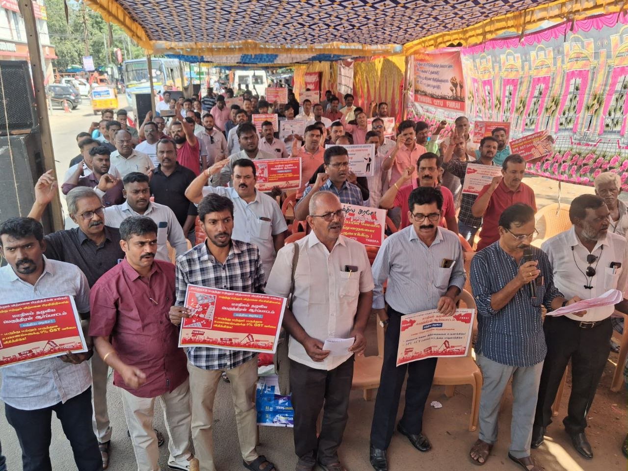 திருச்சியில் இன்று (டிசம்பர் 15) மத்திய பேருந்து நிலையம் அருகில் தமிழ்நாடு மருந்து மற்றும் விற்பனை பிரதிநிதிகள் சங்கத்தினர் மத்திய அரசை கண்டித்து ஆர்ப்பாட்டத்தில் ஈடுபட்டனர்.