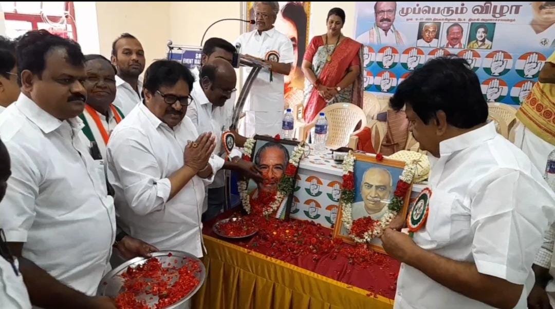 காமராசர் பிறந்த நாள் விழா, குமரிஅனந்தன் நினைவேந்தல், மற்றும் சிவாஜி கணேசன் நினைவு நாள் ஆகிய முப்பெரும் விழா திருச்சி மெயின்காட்கேட்டில் உள்ள மாநகர் மாவட்ட காங்கிரஸ் கட்சி தலைமை அலுவலகமான அருணாச்சல மன்றத்தில், இலக்கிய அணியின் தலைவர் புத்தன் தலைமையில் இன்று நடைபெற்றது. இதில் காமராஜர், குமரிஆனந்தன், சிவாஜிகணேசன் ஆகியோரது உருவ படங்களுக்கு மலர் தூவி மரியாதை செலுத்தப்பட்டது. இந்நிகழ்வில் தமிழ்நாடு காங்கிரஸ் கமிட்டி முன்னாள் மாநில தலைவர் திருநாவுக்கரசர் மற்றும் செய்தி தொடர்பாளர் திருச்சி வேலுச்சாமி, மாவட்ட தலைவர்கள் ரெக்ஸ், கலை உள்பட நிர்வாகிகள் திரளாக கலந்து கொண்டனர்.