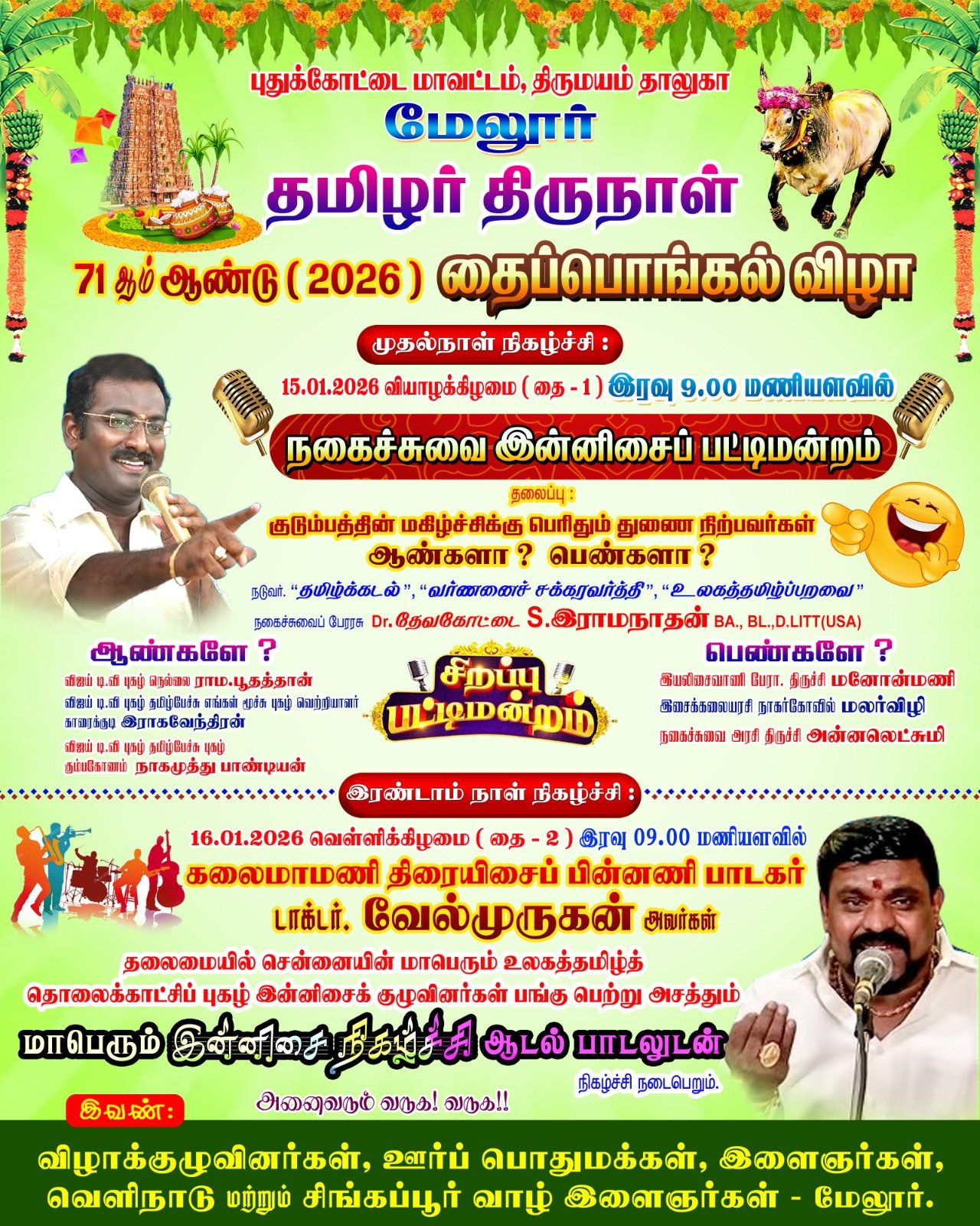மேலூரில் 71 ஆம் ஆண்டு தமிழர் திருநாள் நன்னாளில் மிக சிறப்பான பள்ளி மாணவ மாணவிகளுக்கான விளையாட்டுப் போட்டிகள் 15 1 2026 வியாழக்கிழமை காலை 10 மணிக்கு நடைபெறும் அதனைத் தொடர்ந்து அன்று இரவு 9 மணி அளவில்