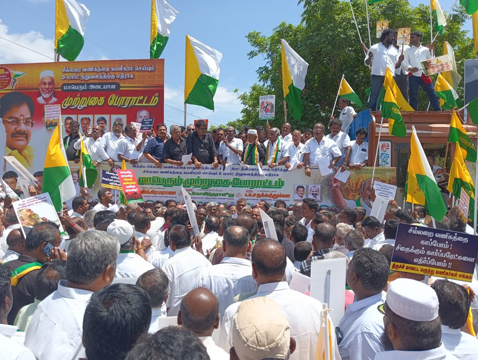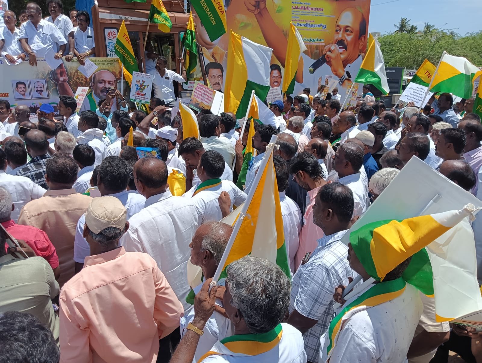 தமிழ்நாடு வணிகர் சங்கங்களின் பேரமைப்பின் மாநில தலைவர் விக்கிரம ராஜா தலைமையில் சிறு குரு வணிகர்களின் வாழ்வாதாரத்தை பாதிக்கும் வகையில் திருச்சி வயலூர் சாலையில் வர உள்ள புதிய டி மார்ட் நிறுவனத்தை கண்டித்து முற்றுகை போராட்டம் திருச்சி வயலூர் சாலையில் டி மார்ட் புதிய கார்ப்பரேட் நிறுவனம் முன்பு இன்று நடைபெற்றது. இந்த ஆர்ப்பாட்டத்தில் தமிழ்நாடு முழுவதும் உள்ள வணிகர் சங்கங்களின் பேரமைப்பு நிர்வாகிகள், உறுப்பினர்கள் ஆயிரக்கணக்கானோர் கலந்து கொண்டனர்.